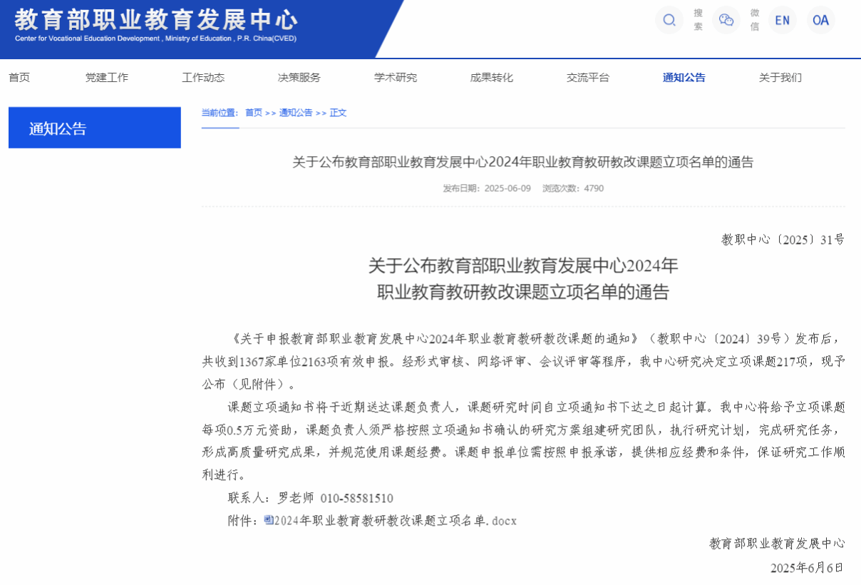 教育部职业教育发展中心近日公布2024年度职业教育教研教改课题立项名单,我校智能制造学院机械制造教师团队申报的《数智时代高职生AI信息素养的角色互嵌型培养模式研究》课题从全国2163项申报中脱颖而出,标志着研究团队在职业教育教学改革与创新方面的探索得到了国家层面的高度认可。