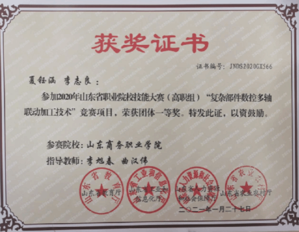 山东省“复杂部件数控多轴联动加工”竞赛项目一等奖