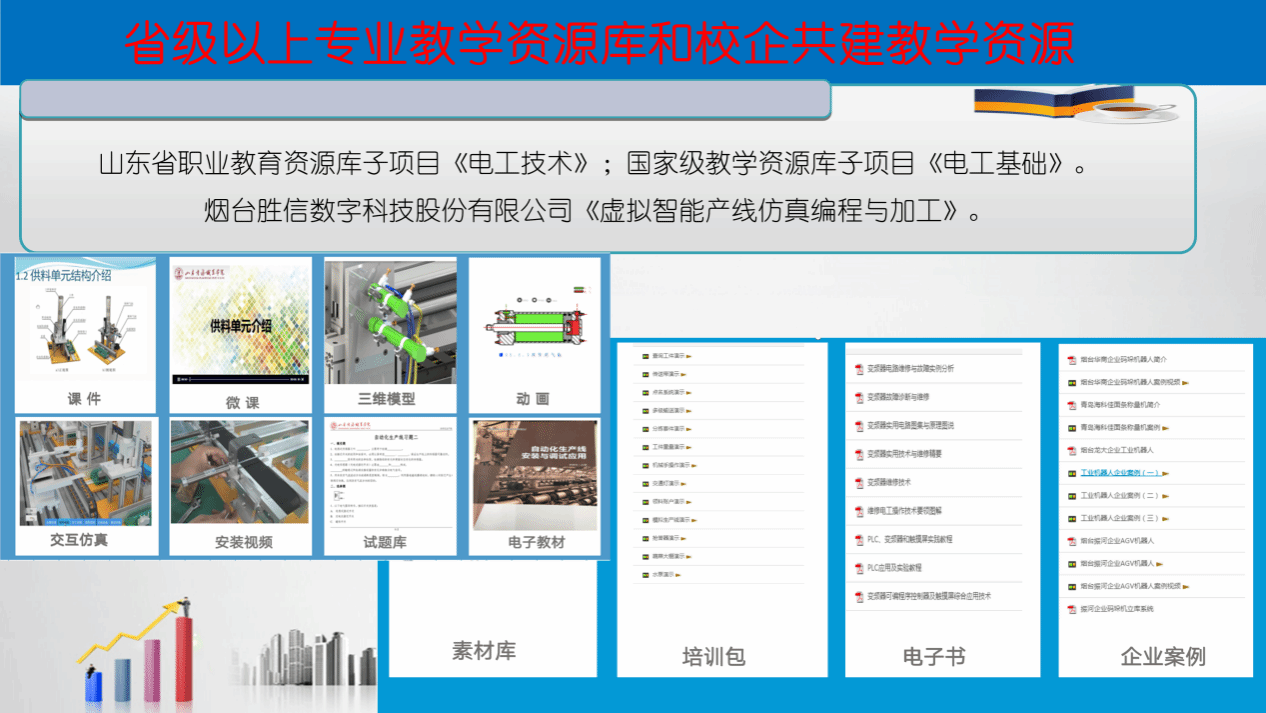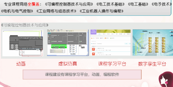 建有省级精品资源共享课3门、国家级教学资源库课程4门,校企联合开发《工业机器人应用实训教程》《PLC编程与自动化生产线调试》等8本活页式教材,开发智能产线虚拟仿真系统、电气控制3D互动教学资源库,构建“虚实结合”教学体系。