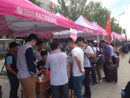 又是活力四射的九月,伴随着新学期的到来,我系2014级新生也陆续到达我校前来报到。为使迎新工作顺利进行,9月4号由我系辅导员刘凯老师对迎新人员进行了培训,8号下午,我系工作人员搬好桌椅、搭好帐篷建立了我们机电工程系新生报到大本营。系主任段彩云、副主任王强、文洪莉等领导老师前来视察迎新工作,并对迎新工作人员表示慰问。
