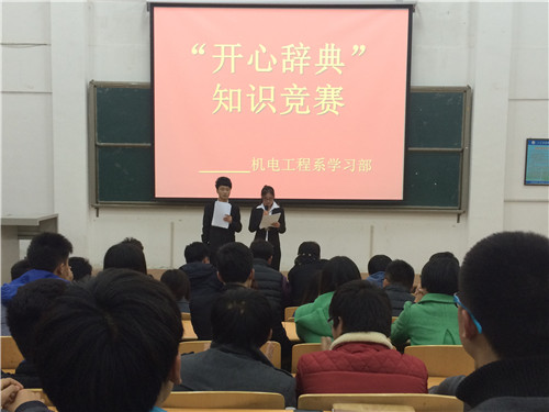 为推进机电工程系学风建设工作,提高学生的学习兴趣,促进学生全面、健康的成长,展现机电工程系之风采。11月21日晚上,机电工程系学习部在二号楼第一阶梯教室举办了以“开心辞典”为主题的知识竞赛。机电工程系辅导员王晓萌老师以及各系团总支学生会干部作为嘉宾,到现场为选手加油助威,14级各班学生积极参加。