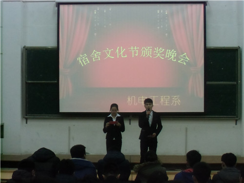 为优化宿舍生活环境,倡导宿舍文明,促进宿舍和谐,给广大同学们提供一个舒适、温馨的学习生活环境,营造良好的宿舍文化氛围,机电工程系劳卫部、女生部和安保部于12月30日晚上7:00在二号一阶教室举办了宿舍安全文化节颁奖晚会,机电工程系辅导员李延涛、王晓萌出席了本次活动,14级学生代表参加了此次晚会。
