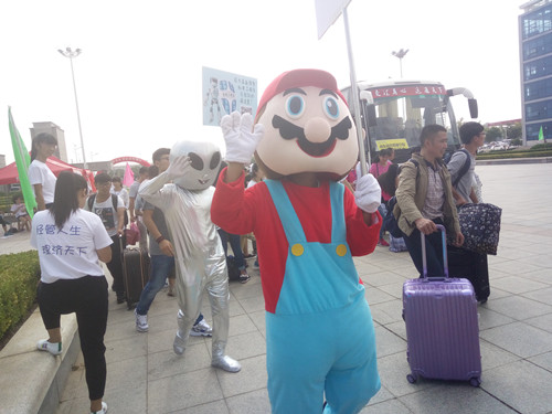 “哇,好可爱,能合个影吗?”一名前来报道的新生停在两只可爱的吉祥物前问道。