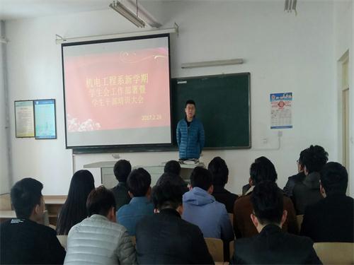 2月26日下午,机电工程系学生组织在二号教学楼召开新学期学生干部工作会议,机电工程系辅导员刘凯、李延涛老师及全体学生干部参加本次会议。