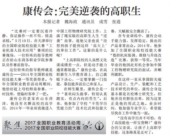 5月13日,中国教育报在02版“新闻·要闻”专栏报道了2014级机电工程系优秀毕业生康传会的就业故事,让社会各界更直观地感受和体验到了我校职业教育的精彩,进一步提高了我校在全国范围内的社会知名度、影响力和吸引力,也为我校正在如火如荼开展的职业教育活动周增添浓重一笔。