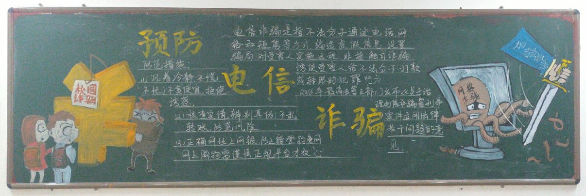 为了让每位学生在日常生活和学习中时刻保持警觉,也为了让学生们能够直接、有效地牢记防范知识,机电工程系精心制作了一系列宣传标语和宣传展板,各班级也绘制了防电信网络诈骗黑板报,不论是置身在校园里,还是在课堂、宿舍中,防电信诈骗知识的宣传无处不见,让防电信网络诈骗观念时刻萦绕在学生的脑海中。
