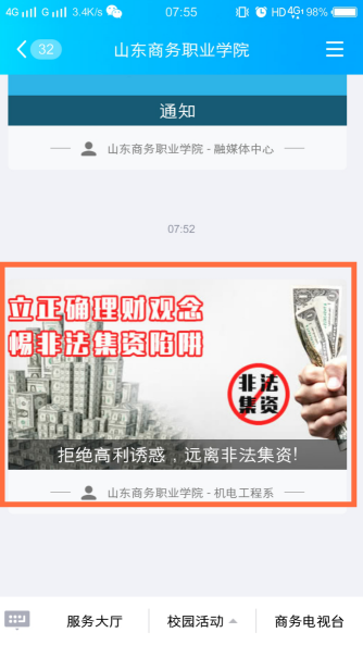 5月28日,各班召开主题班会,向同学们讲解了非法集资的形式和危害,大力宣传了防范非法集资的重要性,告诫同学们要警惕以投资金融中介、私募股权投资、众筹融资、网络借贷等形式的非法集资,同时还引用了身边的实例来讲述借贷后会造成利滚利、还款难上加难的不可逆危害。