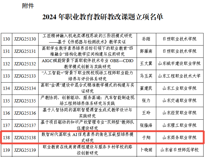 教育部职业教育发展中心近日公布2024年度职业教育教研教改课题立项名单,我校智能制造学院机械制造教师团队申报的《数智时代高职生AI信息素养的角色互嵌型培养模式研究》课题从全国2163项申报中脱颖而出,标志着研究团队在职业教育教学改革与创新方面的探索得到了国家层面的高度认可。