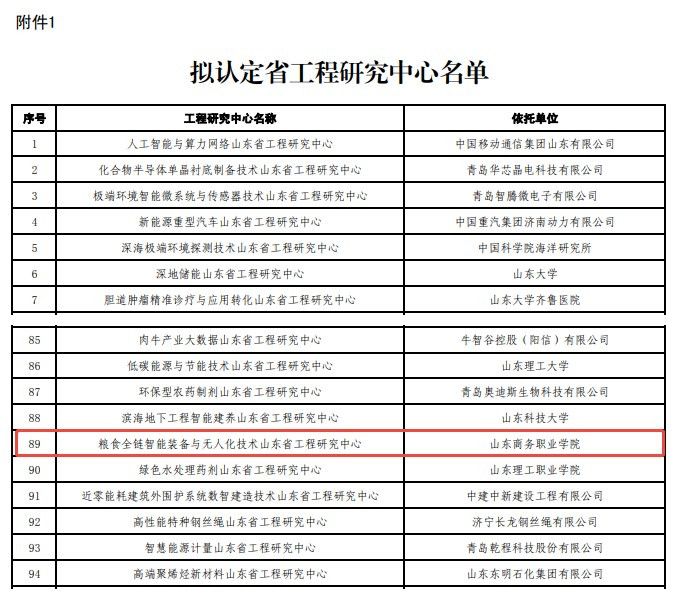 近日,山东省发展和改革委员会公布了2025年度山东省工程研究中心认定名单,其中,由山东商务职业学院智能制造学院牵头申报的“粮食全链智能装备与无人化技术山东省工程研究中心” (以下简称“工程研究中心”)成功入选。这是学院在推动粮食产业数字化与智能制造深度融合方面取得的重要成果,标志着学院在智能装备、无人化技术及产业应用研究领域迈上了新台阶。