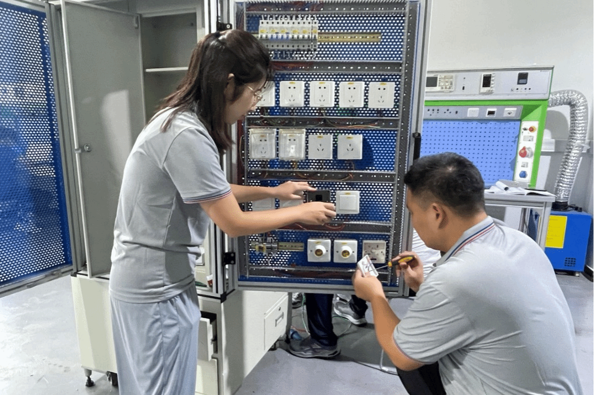 本次培训内容丰富且实用,以“安全—基础—应用—综合”为主线,设置四大核心模块,并融入德国VDE电气安全标准与中国GB国家标准:安全用电规范,涵盖工业场景触电急救、设备接地与漏电保护技术,通过模拟工厂电气安全巡检项目,强化教师应急处理能力;检修电源箱装配,基于企业真实案例,完成电源箱结构设计、元器件布局及线路调试,工艺标准对标德国VDE认证要求;直流电源与逻辑电路制作,设计并调试直流电源电路及分立门电路(与门/或门/非门),融入工业机器人控制电路板维修实操;一居室电路的安装与调试,集成照明、插座、弱电系统及物联网技术,从电路设计、布线到设备安装和调试,完整地还原了实际工程项目的流程,实现远程控制、场景联动等智能家居功能,贴合产业数字化趋势。