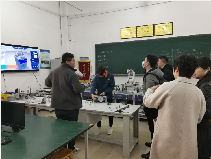 华航唯实公司人员全方位的考察了智能制造学院实训楼,认真聆听各工作室负责人的细致介绍,对学院虚拟仿真应用平台搭建和大赛成果转化方面取得的成绩充分肯定,对学院教师深耕技术应用、求真务实的研究态度给予高度评价,对工作室以项目为载体,师生共同完成企业项目的教学育人模式深表认可。