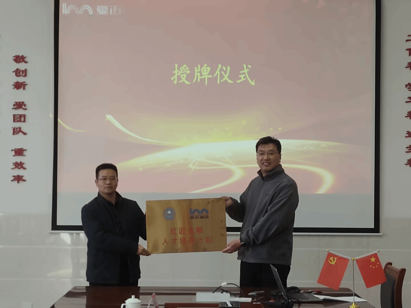 仪式现场,魏彦波院长向豪迈集团授予 “金匠红粮人才培养计划” 牌匾,标志着校企合作迈向更深层次、更实举措的协同育人新阶段。此次订单班采用 “工学交替、校企轮训” 模式,学员将赴豪迈工匠学院开展为期一学期的沉浸式学习,在现代化实训场景中对接行业前沿技术,践行 “知行合一” 的育人理念,实现从校园到职场的平稳过渡。