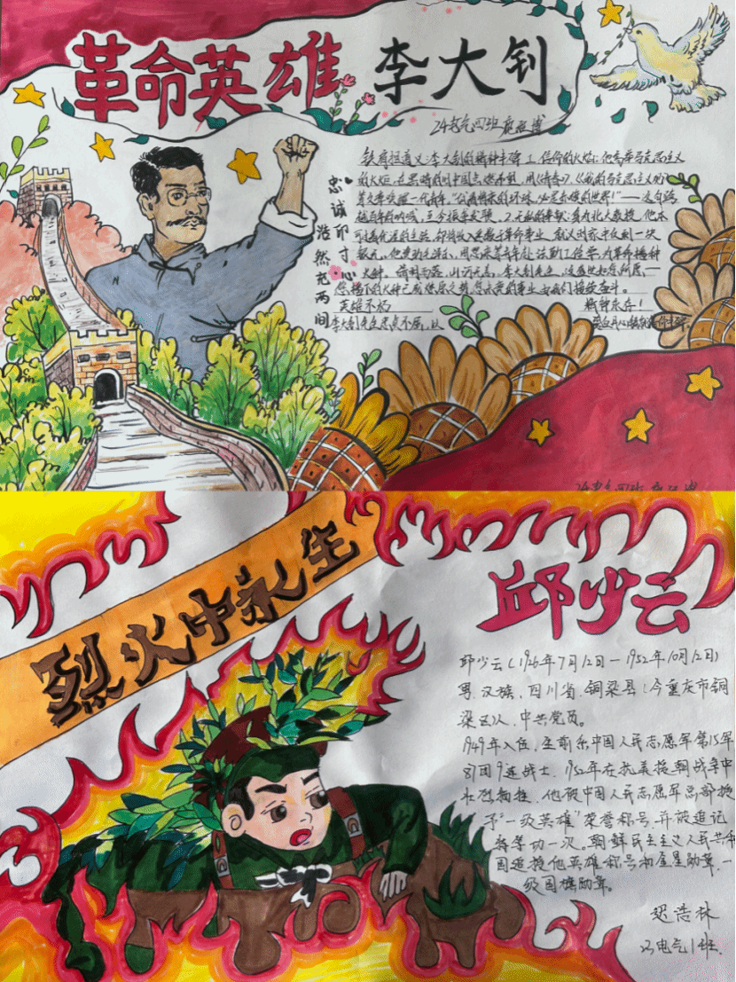 在智能设备与代码交织的校园里,这场以“缅怀先烈 致敬英雄”为主题的绘画活动,如同一场精神的“源代码”更新。这些卡片上,不仅有栩栩如生的英雄画像,还写满了同学们对英雄的敬意与祝福。“向英雄学习,做新时代好青年!”“英雄的精神,永远激励着我前进!”一句句真挚的话语,道出了同学们的心声。李大钊先生高举马克思主义的火炬,为旧中国点燃希望;钢铁战士邱少云,全身烧焦仍纹丝不动。“青山有幸埋忠骨,烈火无情铸英魂。”