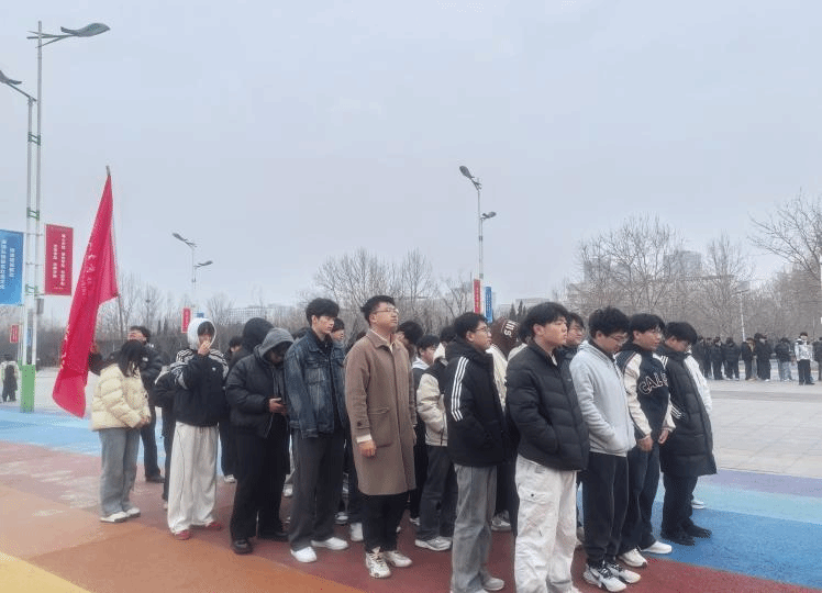 清晨的校园,寒意未消,宁静依旧。智能制造学院的同学们精神饱满、整齐列队,开启了一天的早操时光。一面鲜艳的学院旗帜在队伍前方迎风飘扬,指引着方向,也凝聚着集体的力量。