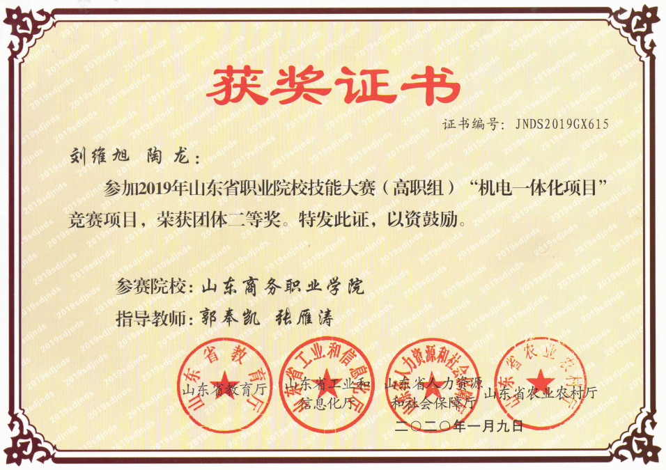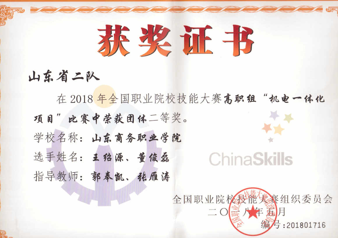 山东省职业院校技能大赛“机电一体化项目”二等奖