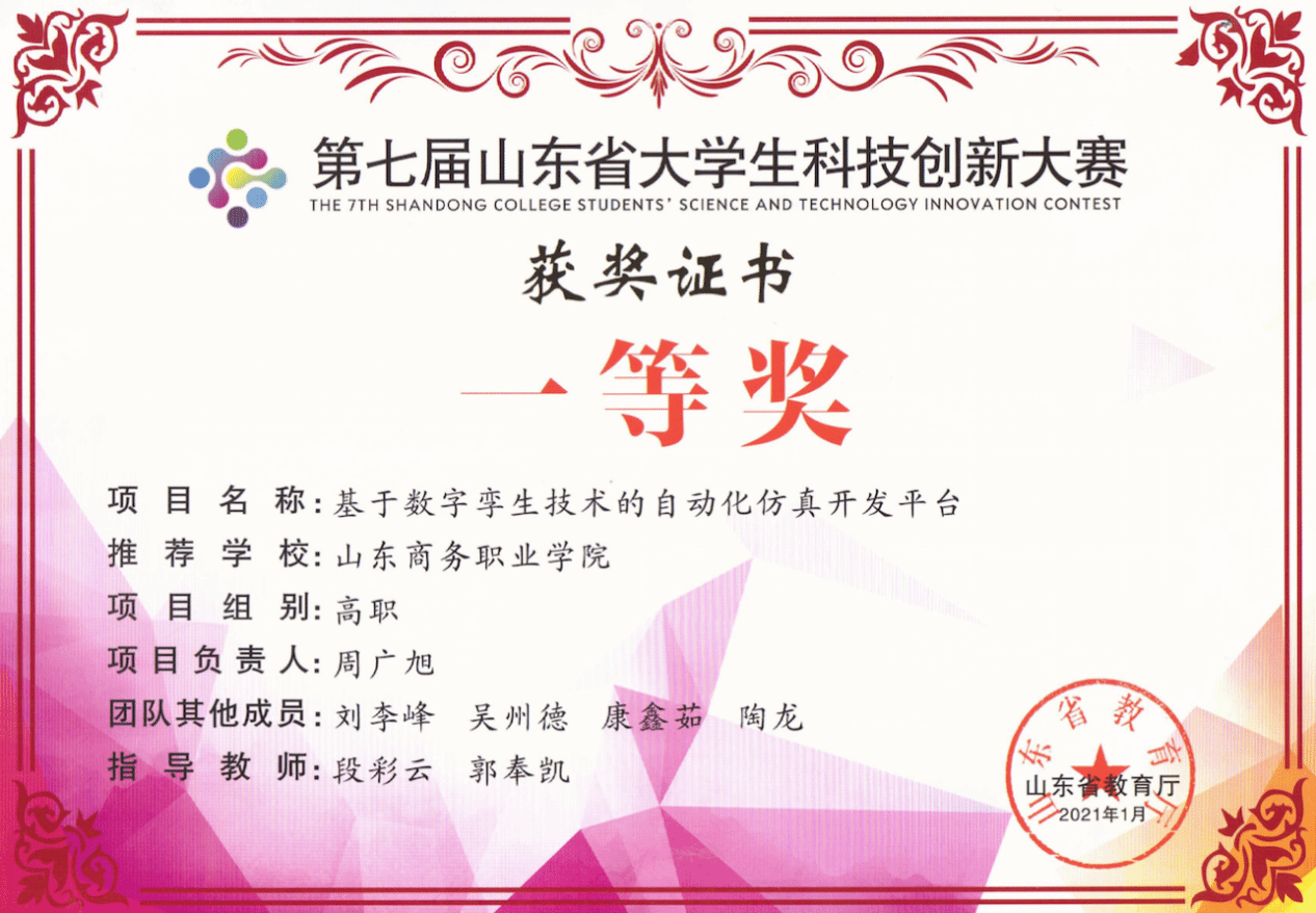 2019级电气1班周广旭: 2021年山东省职业院校技能大赛“机电一体化项目”一等奖;2020年第七届山东省大学生科技创新大赛省赛一等奖(金奖);2021年第八届山东省大学生科技创新大赛省赛二等奖;2021年第七届山省职“互联网+”大学生创新创业大赛银奖 现任济宁第一职业中等专业学校教师;2022年度济宁市技术能手。 |