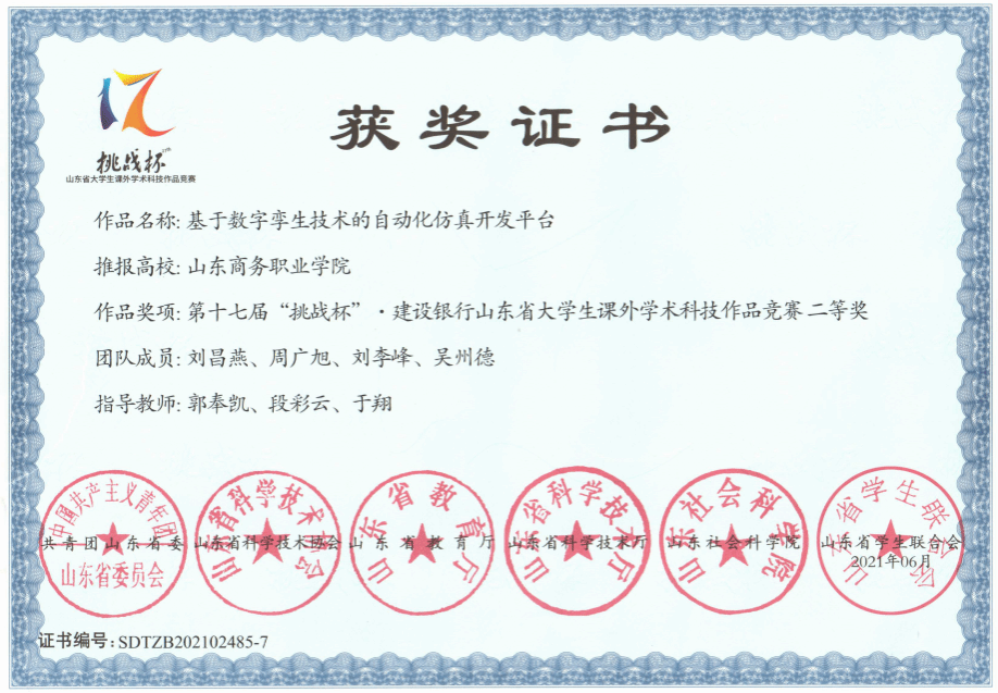 2021级电气1班沈天宇: 2022年7月第八届“互联网+”大赛省赛铜奖;2023年5月带队获得第十八届“挑战杯”建设银行山东省大学生课外学术科技作品竞赛一等奖;2023年7月带队获得第九届“互联网+”大赛省赛金银。 现就职于山东雁翔机电工程有限公司培训部担任主管一职。2024年12月由于其培训效果出色,培训成绩显著获得公司奖金及表彰。 |