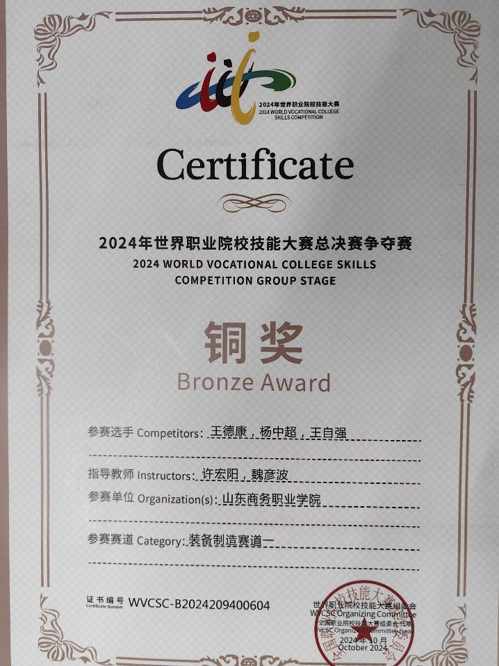 在校成绩:获得金砖国家职业院校技能大赛一等奖